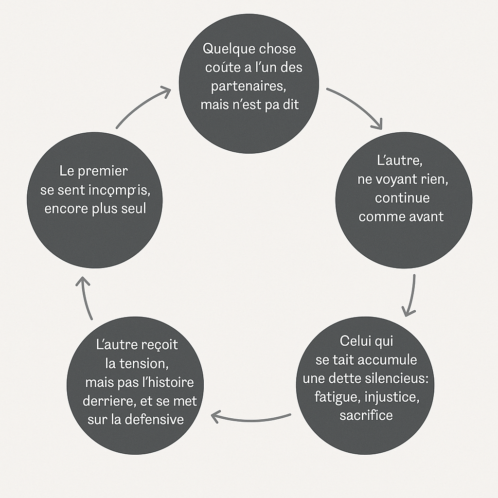 Ces « dettes » sont faites de temps, d’énergie, de concessions, de fatigue, de « je fais parce qu’il faut bien », de « je n’ai rien dit parce que je ne voulais pas de conflit ».  Des dettes silencieuses qui, à force de s’accumuler, finissent par devenir des reproches, des cris, des retraits, des fatigues profondes.